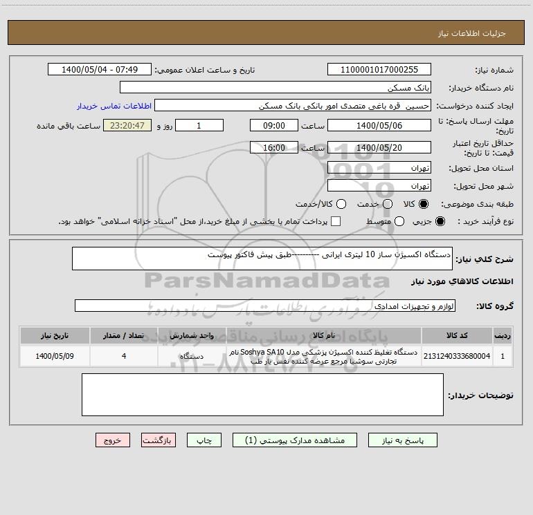 شرح کلی نیاز: دستگاه اکسیژن ساز 10 لیتری ایرانی ----------طبق پیش فاکتور پیوست