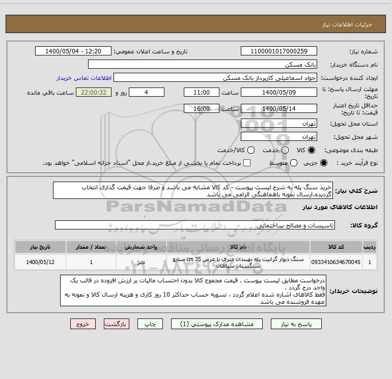 شرح کلی نیاز: خرید سنگ پله به شرح لیست پیوست - کد کالا مشابه می باشد و صرفا جهت قیمت گذاری انتخاب گردیده.ارسال نمونه باهماهنگی الزامی می باشد