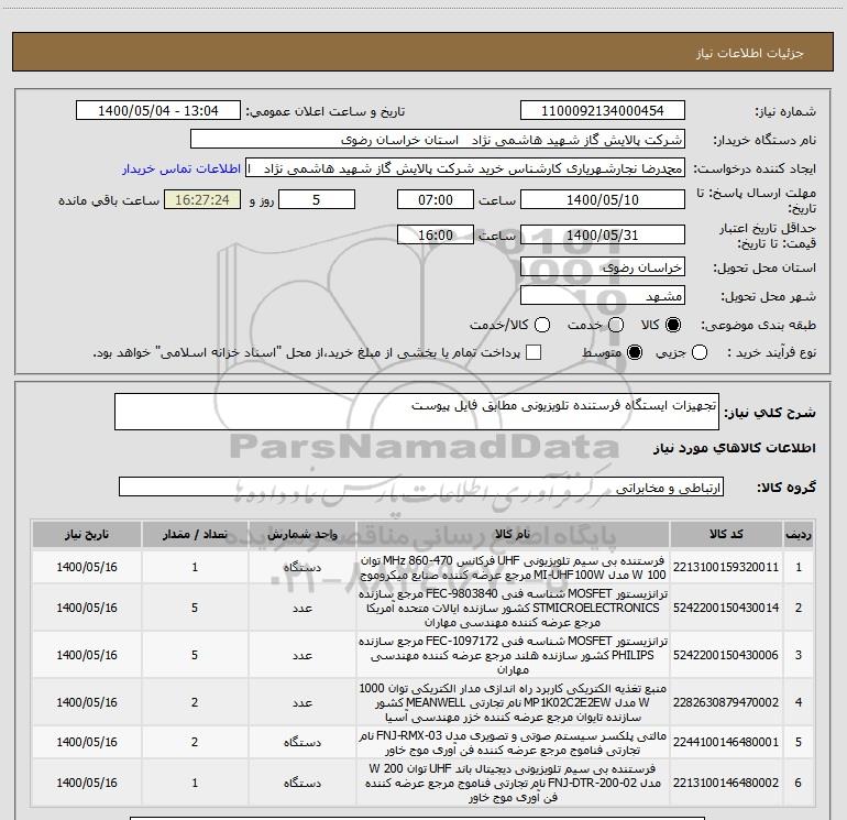 نام دستگاه خریدار:شرکت پالایش گاز شهید هاشمی نژاد استان خراسان رضوی