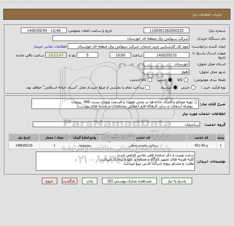 شرح کلی نیاز: تهیه مصالح و اجرای جاده ها در بخش اولویت و قسمت ورودی پست 400 پیروزان بهمراه آسفالت و سایر کارهای لازم (مطابق مشخصات و نقشه های پیوست)