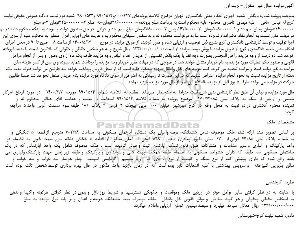 بموجب پرونده شماره بایگانی شعبه اجرای احکام مدنی دادگستری تهران موضوع کلاسه پروندهای 0000447و9901514 و9901533 شعبه دوم نیابت دادگاه عمومی حقوقی نیابت کرج له عباس مافی علیه مهدی ناصری محکوم علیه محکوم است به پرداخت مبلغ پرونده1- 216000000تومان-به مبلغ 2- 325000000تومان 3-و مبلغ 516000000تومان ومبلغ نیم عشر 1-10800000تومان 2-16250000تومان 3-25800000تومان مبلغ نیم عشر دولتی در حق صندوق دولت. با توجه به اینکه محکوم علیه در مهلت قانونی در مهلت مقرر نسبت به انجام مفاد حکم اقدام ننموده است بنا به درخواست محکوم له و به منظور استیفای محکوم به و هزینه های اجرایی اموال متعلق به محکوم علیه از سوی این اجرا توقیف و توسط کارشناسی دادگستری کرج بشرح ذیل توصیف و ارزیابی شده و مقرر گردیده از طریق مزایده در مورخ 1400/5/13 از ساعت 8 صبح تا 9 در محل اجرای احکام مدنی شعبه دادگستری کرج از طریق مزایده بفروش برسد. مزایده از قیمت133/000/000/000 ریال شروع و به هر شخص حقیقی و حقوقی که بالاترین قیمت را بدهد فروخته خواهد شد. ده درصد از وجه مزایده را فی المجلس بصورت وجه نقد یا چک بانکی تضمینی از خریدار اخذ و الباقی وجه مزایده ظرف یک ماه از وی وصول و پس از انجام مراحل قانونی و صدور حکم تملیک مورد مزایده به نام خریدار منتقل خواهد شد. در صورتی که در مهلت مقرر خریدار وجه مزایده را پرداخت ننماید سپرده وی پس از کسر هزینه های مزایده به نفع دولت ضبط و مزایده تجدید می گردد. کلیه هزینه های نقل وانتقال بعهده محکوم علیه است که از محل فروش پرداخت خواهد شد طرفین می توانند ظرف مدت یک هفته از تاریخ مزایده نسبت به نحوه انجام مزایده اعتراض نمایند که در این صورت تا رسیدگی به اعتراض از سوی دادگاه مورد مزایده بنام خریدار منتقل نخواهد شد ضمنا طالبین شرکت در مزایده می توانند ظرف 5 روز قبل از مزایده بااطلاع این اجرا از مال مورد مزایده بازدید نمایند.