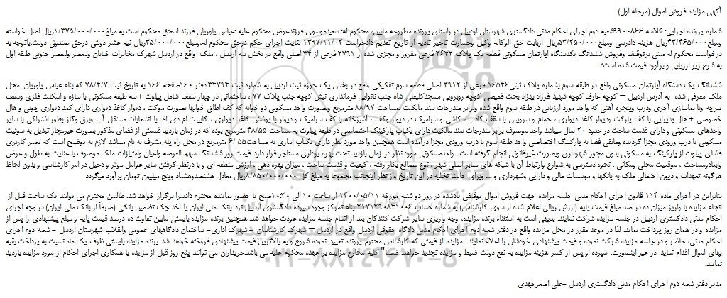 شماره پرونده اجرایی: کلاسه 9900866شعبه دوم اجرای احکام مدنی دادگستری شهرستان اردبیل در راستای پرونده مطروحه مابین، محکوم له: سعیدموسوی فرزندعوض محکوم علیه :عباس یاوریان فرزند اسحق محکوم است به مبلغ1/375/000/000ریال اصل خواسته ومبلغ43/465/000ریال هزینه دادرسی ومبلغ53/250/000ریال ازبابت حق الوکاله وکیل وخسارت تاخیر تادیه از تاریخ تقدیم دادخواست 1397/11/02 لغایت اجرای حکم درحق محکوم له،ومبلغ35/000/000ریال نیم عشر دولتی درحق صندوق دولت،باتوجه به درخواست محکوم له مبنی برتوقیف وفروش ششدانگ یکدستگاه اپارتمان مسکونی قطعه یک پلاک 3632 فرعی مفروز و مجزی شده از 2791 فرعی از 34 اصلی واقع در بخش سه اردبیل ، ملک واقع در اردبیل شهرک مخابرات خیابان ولیعصر ولیعصر جنوبی طبقه اول به شرح زیر ارزیابی و برآورد قیمت شده است؛