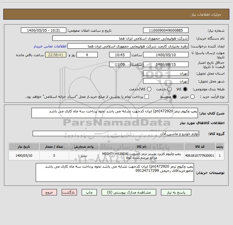 شرح کلی نیاز: پمپ وکیوم ترمز pn(472920) ایران کدجهت تشابه می باشد نحوه پرداخت سه ماه کاری می باشد