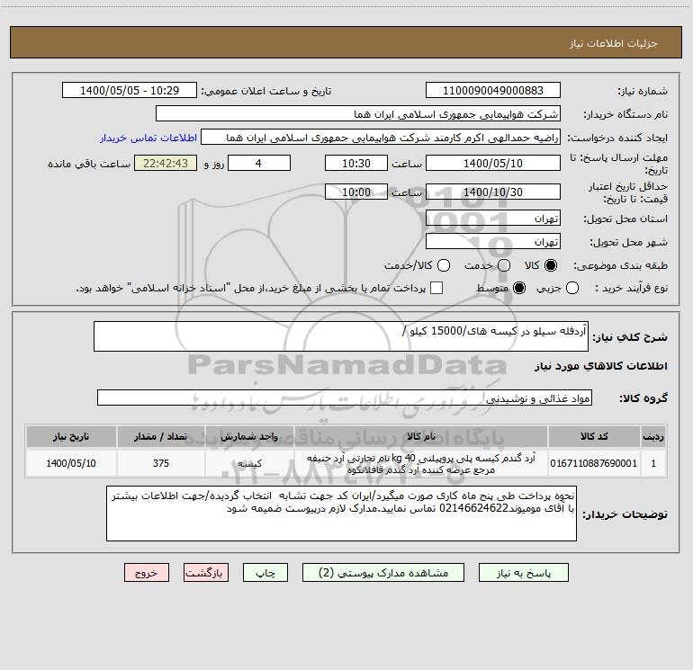 شرح کلی نیاز: آردفله سیلو در کیسه های/15000 کیلو /