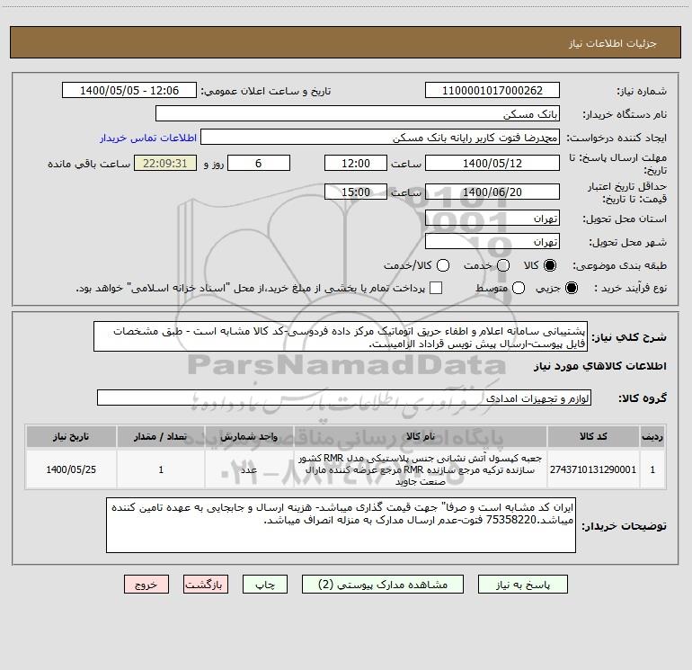 شرح کلی نیاز: پشتیبانی سامانه اعلام و اطفاء حریق اتوماتیک مرکز داده فردوسی-کد کالا مشابه است - طبق مشخصات فایل پیوست-ارسال پیش نویس قراداد الزامیست.