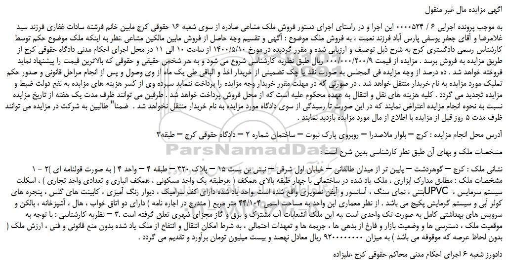 به موجب پرونده اجرایی 6 / 0000524 این اجرا و در راستای اجرای دستور فروش ملک مشاعی صادره از سوی شعبه 16 حقوقی کرج مابین خانم فرشته سادات غفاری فرزند سید غلامرضا و آقای جعفر یوسفی پارس آباد فرزند نعمت ، به فروش ملک موضوع : آگهی و تقسیم وجه حاصل از فروش مابین مالکین مشاعی .نظر به اینکه ملک موضوع حکم توسط کارشناس رسمی دادگستری کرج به شرح ذیل توصیف و ارزیابی شده و مقرر گردیده در مورخ 1400/5/10 از ساعت 10 الی 11 در محل اجرای احکام مدنی دادگاه حقوقی کرج از طریق مزایده به فروش برسد . مزایده از قیمت 000/000/200/9 ریال طبق نظریه کارشناسی شروع می شود و به هر شخص حقیقی و حقوقی که بالاترین قیمت را پیشنهاد نماید فروخته خواهد شد . ده درصد از وجه مزایده فی المجلس به صورت نقد یا چک تضمینی از خریدار اخذ و الباقی طی یک ماه از وی وصول و پس از انجام مراحل قانونی و صدور حکم تملیک مورد مزایده به نام خریدار منتقل خواهد شد . در صورتی که در مهلت مقرر خریدار وجه مزایده را پرداخت ننماید سپرده وی از کسر هزینه های مزایده به نفع دولت ضبط و مزایده تجدید می گردد . کلیه هزینه های نقل و انتقال به عهده محکوم علیه است که از محل فروش پرداخت خواهد شد . طرفین می توانند ظرف مدت یک هفته از تاریخ مزایده نسبت به نحوه انجام مزایده اعتراض نمایند که در این صورت تا رسیدگی از سوی دادگاه مورد مزایده به نام خریدار منتقل نخواهد شد . ضمنا" طالبین به شرکت در مزایده می توانند ظرف مدت 5 روز قبل از مزایده با اطلاع از مال مورد مزایده بازدید نمایند .