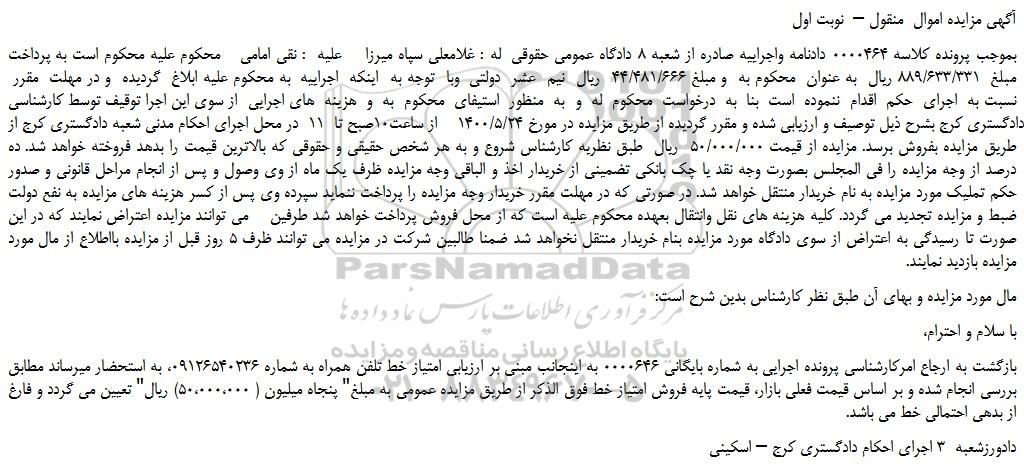 بموجب پرونده کلاسه 0000464 دادنامه واجراییه صادره از شعبه 8 دادگاه عمومی حقوقی له : غلامعلی سپاه میرزا علیه : نقی امامی محکوم علیه محکوم است به پرداخت مبلغ 889/633/331 ریال به عنوان محکوم به و مبلغ 44/481/666 ریال نیم عشر دولتی وبا توجه به اینکه اجراییه به محکوم علیه ابلاغ گردیده و در مهلت مقرر نسبت به اجرای حکم اقدام ننموده است بنا به درخواست محکوم له و به منظور استیفای محکوم به و هزینه های اجرایی از سوی این اجرا توقیف توسط کارشناسی دادگستری کرج بشرح ذیل توصیف و ارزیابی شده و مقرر گردیده از طریق مزایده در مورخ 1400/5/24 از ساعت10صبح تا 11 در محل اجرای احکام مدنی شعبه دادگستری کرج از طریق مزایده بفروش برسد. مزایده از قیمت 50/000/000 ریال طبق نظریه کارشناس شروع و به هر شخص حقیقی و حقوقی که بالاترین قیمت را بدهد فروخته خواهد شد. ده درصد از وجه مزایده را فی المجلس بصورت وجه نقد یا چک بانکی تضمینی از خریدار اخذ و الباقی وجه مزایده ظرف یک ماه از وی وصول و پس از انجام مراحل قانونی و صدور حکم تملیک مورد مزایده به نام خریدار منتقل خواهد شد. در صورتی که در مهلت مقرر خریدار وجه مزایده را پرداخت ننماید سپرده وی پس از کسر هزینه های مزایده به نفع دولت ضبط و مزایده تجدید می گردد. کلیه هزینه های نقل وانتقال بعهده محکوم علیه است که از محل فروش پرداخت خواهد شد طرفین می توانند مزایده اعتراض نمایند که در این صورت تا رسیدگی به اعتراض از سوی دادگاه مورد مزایده بنام خریدار منتقل نخواهد شد ضمنا طالبین شرکت در مزایده می توانند ظرف 5 روز قبل از مزایده بااطلاع از مال مورد مزایده بازدید نمایند.