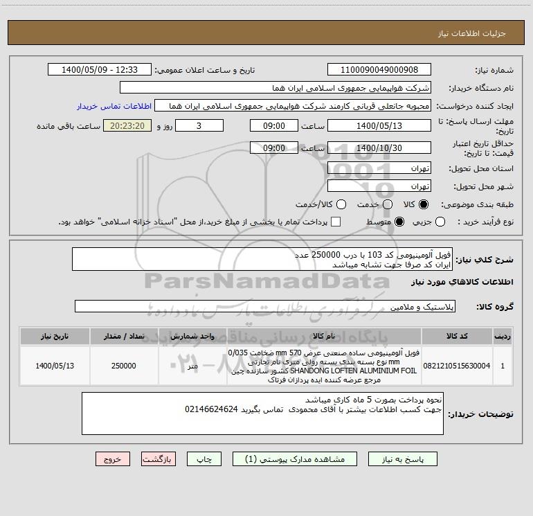 استعلام فویل آلومینیومی کد 103 با درب 250000 عدد ایران کد صرفا جهت تشابه میباشد , استعلام فویل آلومینیومی کد 103 با درب 250000 عدد ایران کد صرفا جهت تشابه میباشد