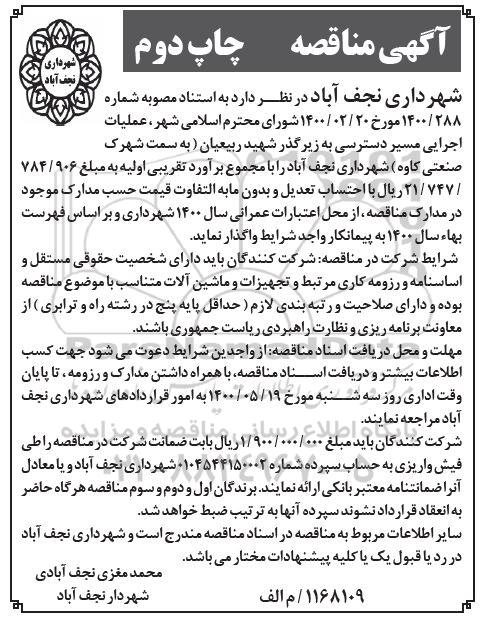 شهرداری نجف آباد به استناد مصوبه شماره 1400/288 مورخ 1400.2.20 شورای محترم اسلامی، عملیات اجرایی مسیر دسترسی به زیرگذر شهید ربیعیان (به سمت شهرک صنعتی کاوه) را با مجموع برآورد تقریبی اولیه به مبلغ 21.747.784.906 ریال با احتساب تعدیل و مابه التفاوت قیمت حسب مدارک موجود در مدارک مناقصه از محل اعتبارات عمرانی سال 1400 شهرداری و براساس فهرست بها سال 1400 به پیمانکار واجد شرایط واگذار نماید.