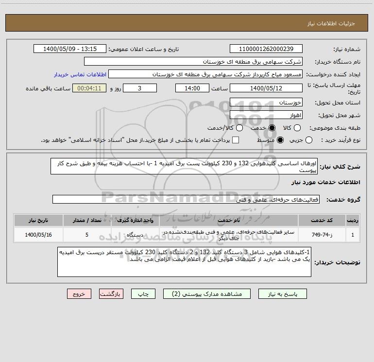 شرح کلی نیاز: اورهال اساسی کلیدهوایی 132 و 230 کیلوولت پست برق امیدیه 1 -با احتساب هزینه بیمه و طبق شرح کار پیوست