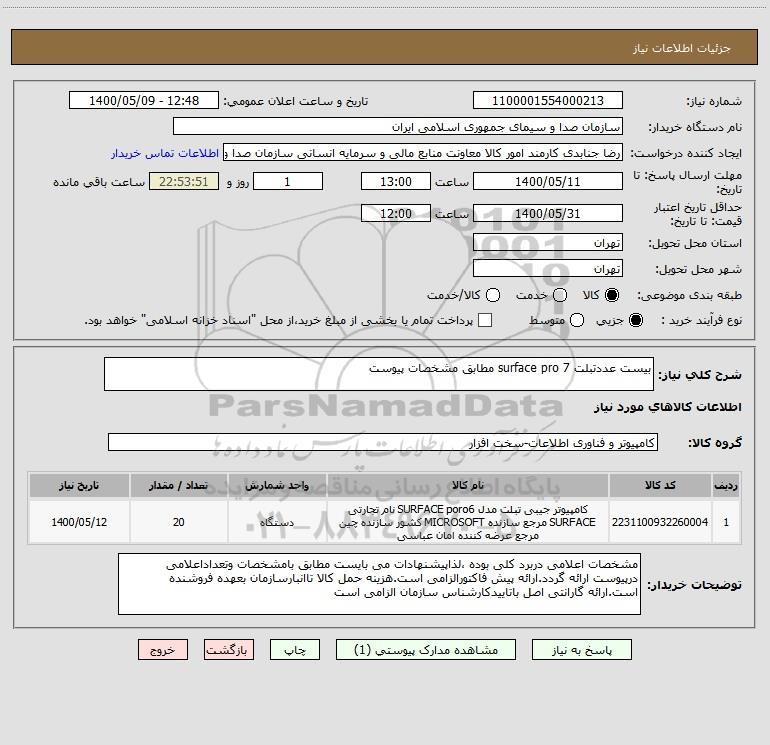 شرح کلی نیاز: بیست عددتبلت surface pro 7 مطابق مشخصات پیوست