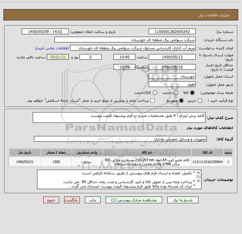 نام دستگاه خریدار:شرکت سهامی برق منطقه ای خوزستان