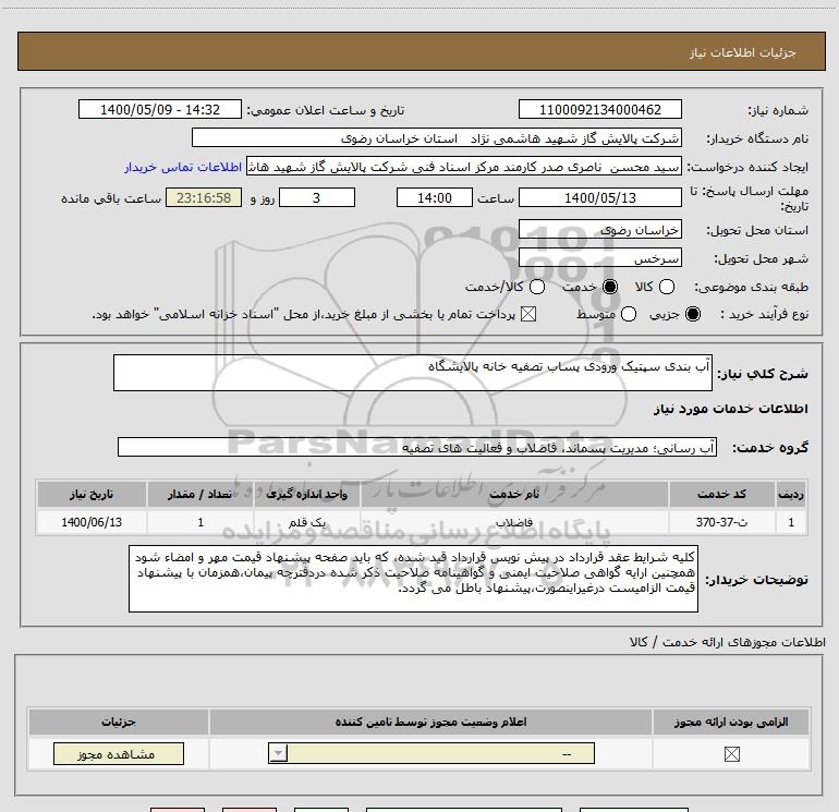 نام دستگاه خریدار:شرکت پالایش گاز شهید هاشمی نژاد استان خراسان رضوی