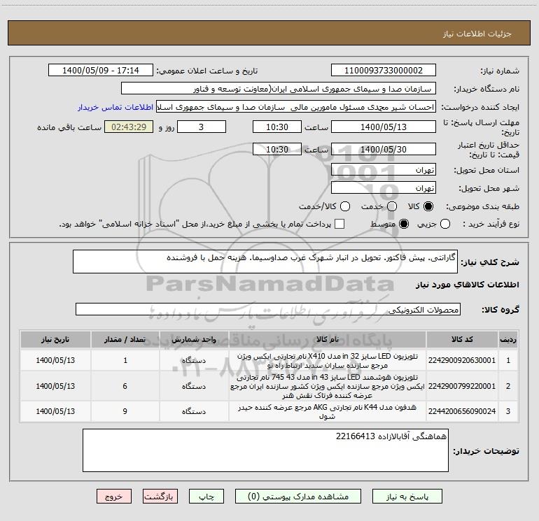 شرح کلی نیاز: گارانتی. پیش فاکتور. تحویل در انبار شهرک غرب صداوسیما. هزینه حمل با فروشنده