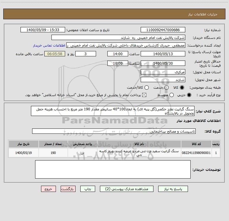 شرح کلی نیاز: سنگ گرانیت نطنز حکمی(گل پنبه ای) به ابعاد100*40 سانیمتر مقدار 190 متر مربع با احتساب هزینه حمل وتحویل در پالایشگاه