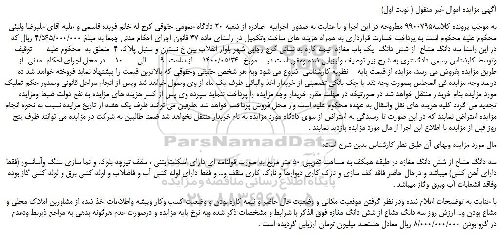 به موجب پرونده کلاسه9900795 مطروحه در این اجرا و با عنایت به صدور اجراییه صادره از شعبه 20 دادگاه عمومی حقوقی کرج له خانم فریده قاسمی و علیه آقای علیرضا ولیئی محکوم علیه محکوم است به پرداخت خسارت قرارداری به همراه هزینه های ساخت وتکمیل در راستای ماده 47 قانون اجرای احکام مدنی جمعا به مبلغ 4/565/000/000 ریال که در این راستا سه دانگ مشاع از شش دانگ یک باب مغازه نیمه کاره به نشانی کرج رجایی شهر بلوار انقلاب بین خ نسترن و سنبل پلاک 4 متعلق به محکوم علیه توقیف وتوسط کارشناس رسمی دادگستری به شرح زیر توصیف وارزیابی شده ومقرر است در مورخ 1400/05/24 از ساعت 9 الی 10 در محل اجرای احکام مدنی از طریق مزایده بفروش می رسد، مزایده از قیمت پایه نظریه کارشناسی شروع می شود وبه هر شخص حقیقی وحقوقی که بالاترین قیمت را پیشنهاد نماید فروخته خواهد شد ده درصد وجه مزایده فی المجلس بصورت وجه نقد یا چک بانکی تضمینی از خریدار اخذ والباقی ظرف یک ماه از وی وصول خواهد شد وپس از انجام مراحل قانونی وصدور حکم تملیک مورد مزایده بنام خریدار منتقل خواهد شد در صورتیکه در مهلت مقرر خریدار وجه مزایده را پرداخت ننماید سپرده وی پس از کسر هزینه های مزایده به نفع دولت ضبط ومزایده تجدید می گردد کلیه هزینه های نقل وانتقال به عهده محکوم علیه است واز محل فروش پرداخت خواهد شد .طرفین می توانند ظرف یک هفته از تاریخ مزایده نسبت به نحوه انجام مزایده اعتراض نمایند که در این صورت تا رسیدگی به اعتراض از سوی دادگاه مورد مزایده به نام خریدار منتقل نخواهد شد ضمنا طالبین به شرکت در مزایده می توانند ظرف پنج روز قبل از مزایده با اطلاع این اجرا از مال مورد مزایده بازدید نمایند .
