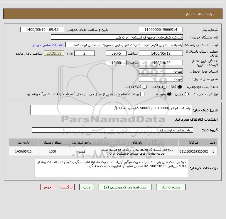 شرح کلی نیاز: برنج فجر ایرانی/10000 کیلو (5000 کیلو مرحله اول)/