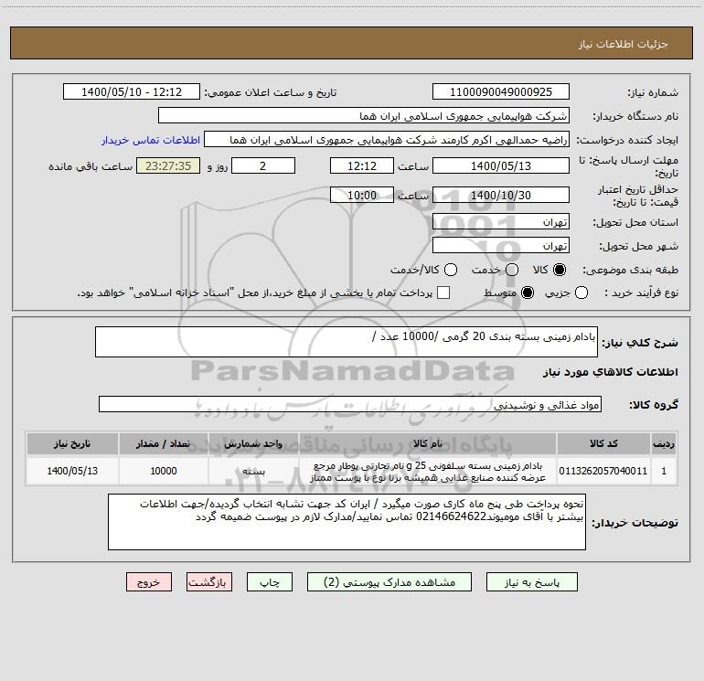 شرح کلی نیاز: بادام زمینی بسته بندی 20 گرمی /10000 عدد /