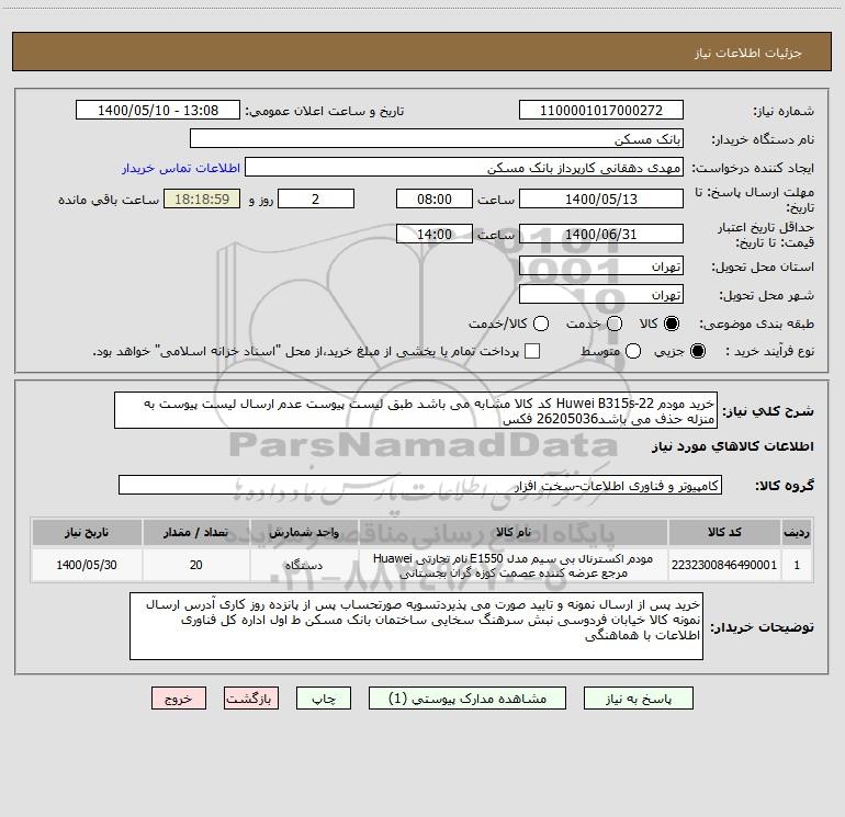 شرح کلی نیاز: خرید مودم Huwei B315s-22 کد کالا مشابه می باشد طبق لیست پیوست عدم ارسال لیست پیوست به منزله حذف می باشد26205036 فکس