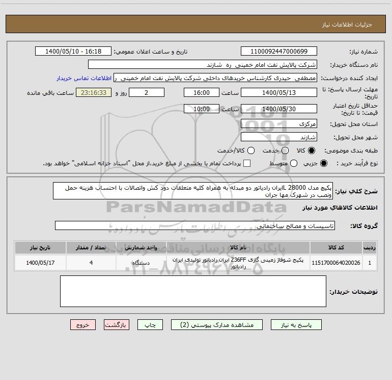 شرح کلی نیاز: پکیچ مدل 28000 Lایران رادیاتور دو مبدله به همراه کلیه متعلقات دود کش واتصالات با احتساب هزینه حمل ونصب در شهرک مها جران