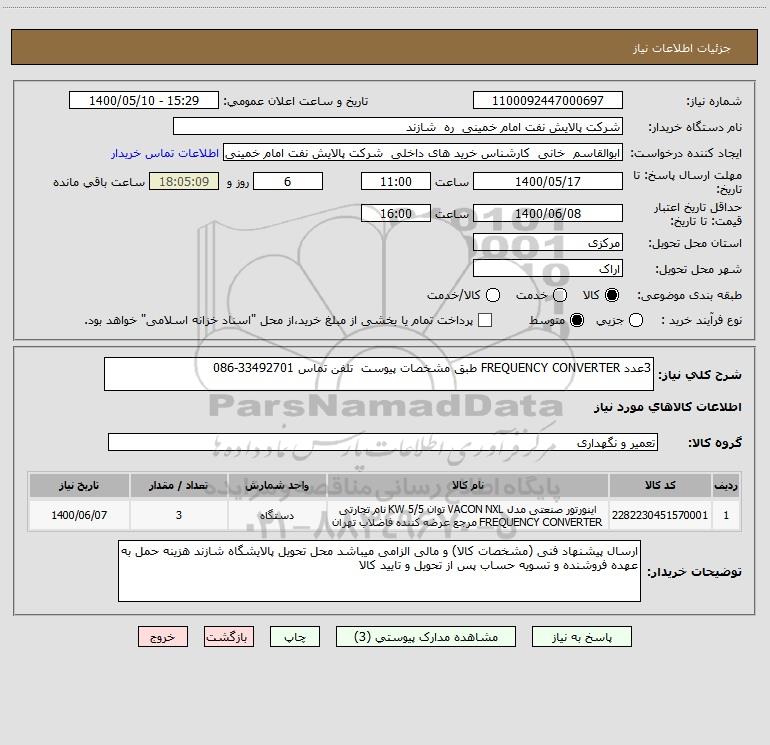 شرح کلی نیاز: 3عدد FREQUENCY CONVERTER طبق مشخصات پیوست تلفن تماس 33492701-086
