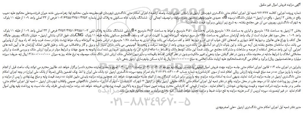 شماره پرونده اجرایی: کلاسه 971227 شعبه اول اجرای احکام مدنی دادگستری شهرستان اردبیل در راستای اجرای نیابت واصله ازشعبه8 اجرای احکام مدنی دادگستری شهرستان قم مطروحه مابین، محکوم لها: زهراحسینی خشه حیران فرزندسیدعلی محکوم علیه :حبیب اله حمیدی علویردیلوفرزندحسین ،مورد مزایده و توصیف اجمالی آن:  ششدانگ یکباب خانه مسکونی به پلاک ثبتی بشماره 102/6355/4751/4752 فرعی از 33 اصلی واحد 109 از طبقه 11 بلوک B واقع در بخش 3 اردبیل ، واقع در: اردبیل– خیابان دانشگاه نرسیده به شهرک دادگستری روبروی سی ان جی مجتمع بنفشه ، به شرح زیر ارزیابی و برآورد قیمت شده است؛