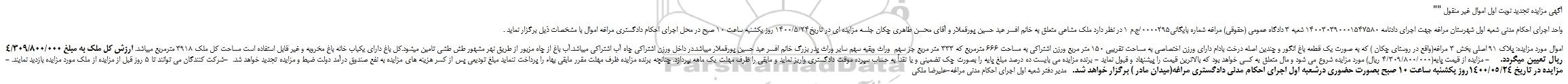 "آگهی مزایده تجدید نوبت اول اموال غیر منقول "