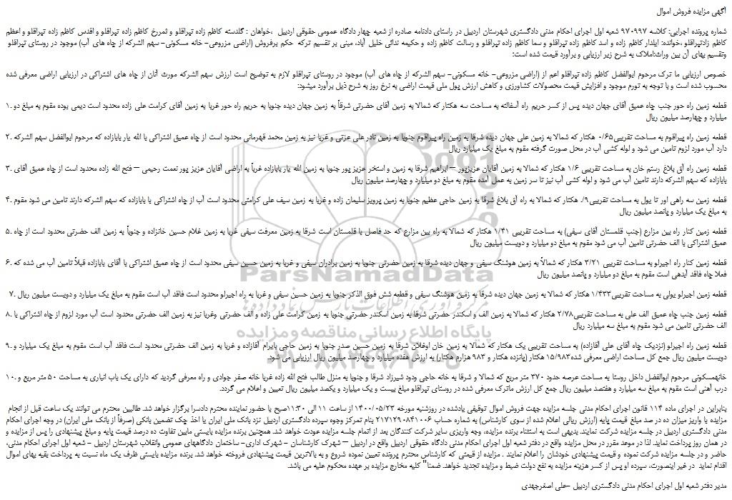 شماره پرونده اجرایی: کلاسه 970997 شعبه اول اجرای احکام مدنی دادگستری شهرستان اردبیل در راستای دادنامه صادره از شعبه چهار دادگاه عمومی حقوقی اردبیل ،خواهان : گلدسته کاظم زاده تپراقلو و ثمررخ کاظم زاده تپراقلو و اقدس کاظم زاده تپراقلو و اعظم کاظم زادتپراقلو ،خوانده: ایلدار کاظم زاده و اسد کاظم زاده تپراقلو و سما کاظم زاده تپراقلو و رسالت کاظم زاده و حکیمه ندائی خلیل آباد، مبنی بر تقسیم ترکه حکم برفروش (اراضی مزروعی- خانه مسکونی- سهم الشرکه از چاه های آب) موجود در روستای تپراقلو وتقسیم بهای آن بین وراث:املاک به شرح زیر ارزیابی و برآورد قیمت شده است؛