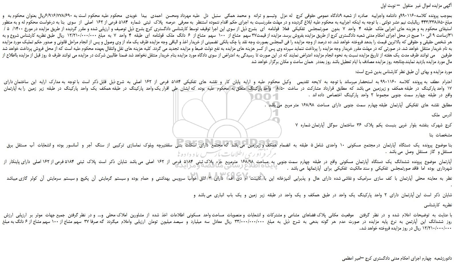 بموجب پرونده کلاسه9901160و دادنامه واجراییه صادره از شعبه 9دادگاه عمومی حقوقی کرج له عزل وتبسم و ترانه و محمد همگی سنبل دل علیه مهرداد ومحسن احمدی بیدا خویدی محکوم علیه محکوم است به 6/916/778/690ریال بعنوان محکوم به و مبلغ443/338/850 ریالبابت نیم عشر دولتی . با توجه به اینکه اجراییه به محکوم علیه ابلاغ گردیده و در مهلت مقررنسبت به اجرای حکم اقدام ننموده استنظر به معرفی عرصه پلاک ثبتی شماره 5184 فرعی از 162 اصلی از سوی بنا به درخواست محکوم له و به منظور استیفای محکوم به و هزینه های اجرایی ملک طبقه 4 واحد 7 بدون صورتمجلس تفکیکی فعلا قولنامه ای بشرح ذیل از سوی این اجرا توقیف توسط کارشناسی دادگستری کرج بشرح ذیل توصیف و ارزیابی شده و مقرر گردیده از طریق مزایده در مورخ 1400/ 5 / 31ازساعت 9 الی 10 صبح در محل اجرای احکام مدنی شعبه دادگستری کرج از طریق مزایده بفروش برسد. مزایده از قیمت37 سهم مشاع از 100 سهم مشاع از 6 دانگ ملک قولنامه ای طبقه 4 واحد 7 به مبلغ 12/210/000/000 ریال طبق نظریه کارشناس شروع و به هر شخص حقیقی و حقوقی که بالاترین قیمت را بدهد فروخته خواهد شد. ده درصد از وجه مزایده را فی المجلس بصورت وجه نقد یا چک بانکی تضمینی از خریدار اخذ و الباقی وجه مزایده ظرف یک ماه از وی وصول و پس از انجام مراحل قانونی و صدور حکم تملیک مورد مزایده به نام خریدار منتقل خواهد شد. در صورتی که در مهلت مقرر خریدار وجه مزایده را پرداخت ننماید سپرده وی پس از کسر هزینه های مزایده به نفع دولت ضبط و مزایده تجدید می گردد. کلیه هزینه های نقل وانتقال بعهده محکوم علیه است که از محل فروش پرداخت خواهد شد طرفین می توانند ظرف مدت یک هفته از تاریخ مزایده نسبت به نحوه انجام مزایده اعتراض نمایند که در این صورت تا رسیدگی به اعتراض از سوی دادگاه مورد مزایده بنام خریدار منتقل نخواهد شد ضمنا طالبین شرکت در مزایده می توانند ظرف 5 روز قبل از مزایده بااطلاع از مال مورد مزایده بازدید نمایند.چنانجه روز مزایده مصادف با ایام تعطیل باشد روز بعددر همان ساعت و مکان برگزار خواهد شد