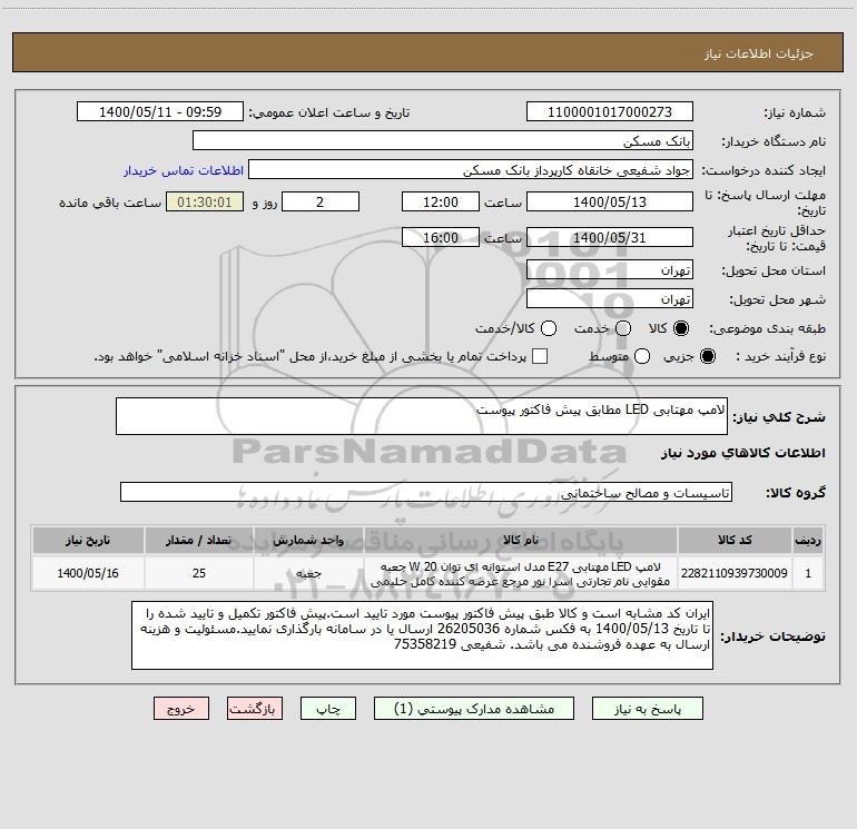 شرح کلی نیاز: لامپ مهتابی LED مطابق پیش فاکتور پیوست