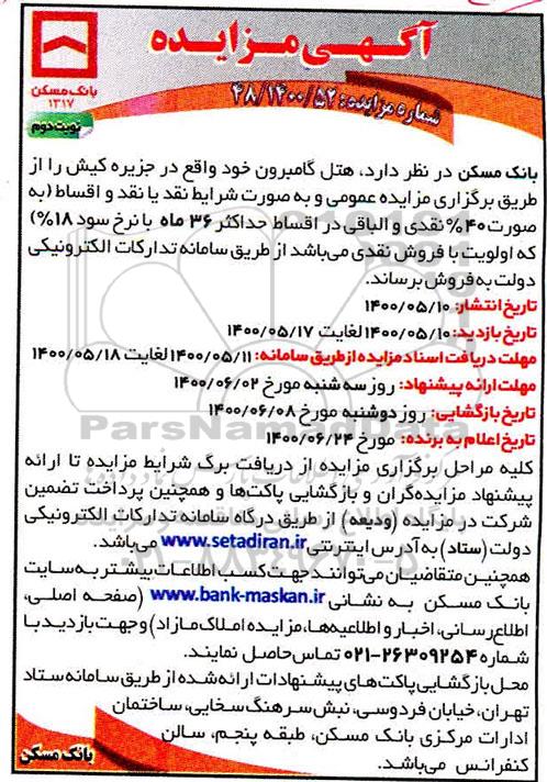 مزایده فروش هتل گامبرون نوبت اول شماره 48.1400.52