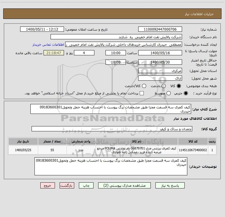 | 1 | 1145110673400002 | کیف کمری برزنتی مدل 06879701 نام تجارتی POUMA مرجع عرضه کننده فرید رمضانی زاده اهوازی | عدد | 55 | 1400/05/25 |