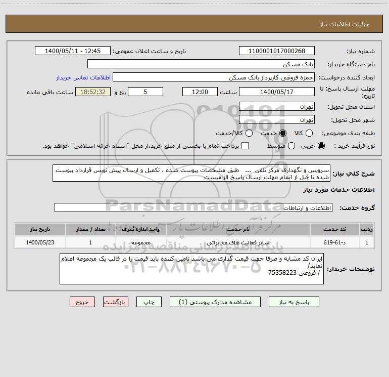 شرح کلی نیاز: سرویس و نگهداری مرکز تلفن ... طبق مشخصات پیوست شده ، تکمیل و ارسال پیش نویس قرارداد پیوست شده تا قبل از اتمام مهلت ارسال پاسخ الزامیست