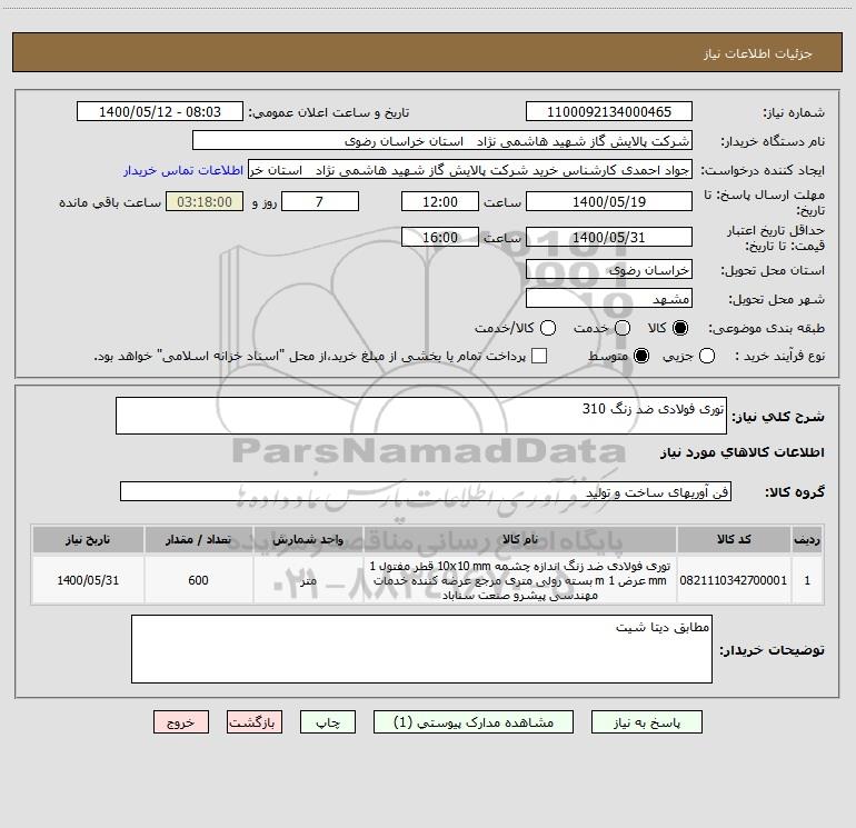نام دستگاه خریدار:شرکت پالایش گاز شهید هاشمی نژاد استان خراسان رضوی