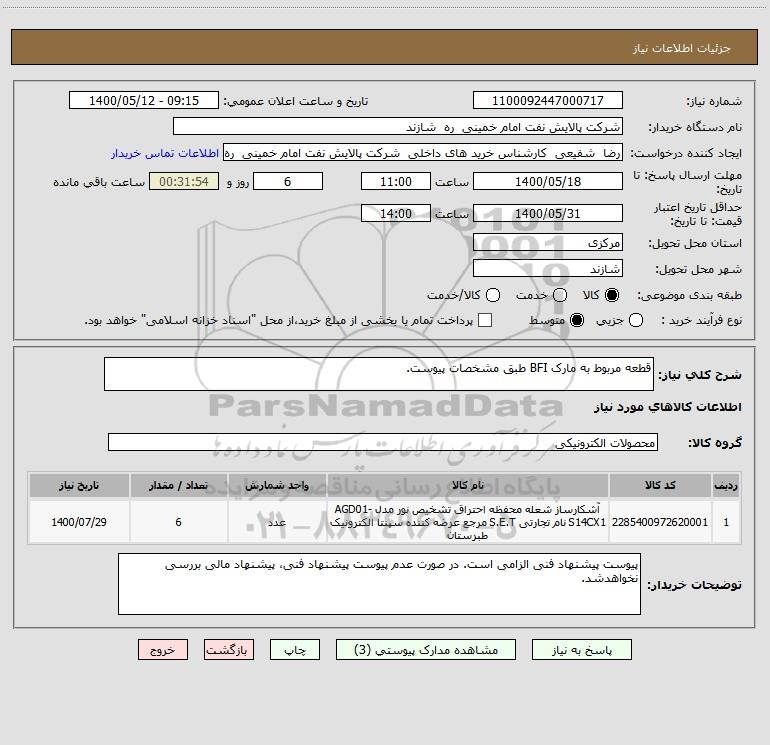شرح کلی نیاز: قطعه مربوط به مارک BFI طبق مشخصات پیوست.