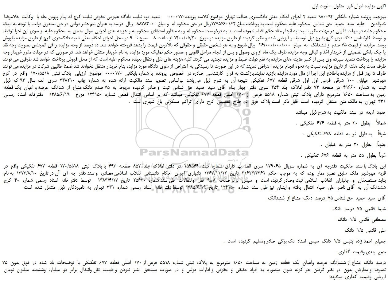 بموجب پرونده شماره بایگانی 980094 شعبه 4 اجرای احکام مدنی دادگستری عدالت تهران موضوع کلاسه پرونده0000170 شعبه دوم نیابت دادگاه عمومی حقوقی نیابت کرج له پیام پروین جاه با وکالت غلامرضا خیرالدین علیه سید حمید حق شناس محکوم علیه محکوم است به پرداخت مبلغ 1775660162ریال در حق محکوم له و مبلغ 88783000 ریال درصد به عنوان نیم عشر دولتی در حق صندوق دولت. با توجه به اینکه محکوم علیه در مهلت قانونی در مهلت مقرر نسبت به انجام مفاد حکم اقدام ننموده است بنا به درخواست محکوم له و به منظور استیفای محکوم به و هزینه های اجرایی اموال متعلق به محکوم علیه از سوی این اجرا توقیف و توسط کارشناسی دادگستری کرج بشرح ذیل توصیف و ارزیابی شده و مقرر گردیده از طریق مزایده در مورخ 1400/05/20 از ساعت 8 صبح تا 9 در محل اجرای احکام مدنی شعبه دادگستری کرج از طریق مزایده بفروش برسد. مزایده از قیمت 75 صدم از ششدانگ به مبلغ 26/000/000/000 ریال شروع و به هر شخص حقیقی و حقوقی که بالاترین قیمت را بدهد فروخته خواهد شد. ده درصد از وجه مزایده را فی المجلس بصورت وجه نقد یا چک بانکی تضمینی از خریدار اخذ و الباقی وجه مزایده ظرف یک ماه از وی وصول و پس از انجام مراحل قانونی و صدور حکم تملیک مورد مزایده به نام خریدار منتقل خواهد شد. در صورتی که در مهلت مقرر خریدار وجه مزایده را پرداخت ننماید سپرده وی پس از کسر هزینه های مزایده به نفع دولت ضبط و مزایده تجدید می گردد. کلیه هزینه های نقل وانتقال بعهده محکوم علیه است که از محل فروش پرداخت خواهد شد طرفین می توانند ظرف مدت یک هفته از تاریخ مزایده نسبت به نحوه انجام مزایده اعتراض نمایند که در این صورت تا رسیدگی به اعتراض از سوی دادگاه مورد مزایده بنام خریدار منتقل نخواهد شد ضمنا طالبین شرکت در مزایده می توانند ظرف 5 روز قبل از مزایده بااطلاع این اجرا از مال مورد مزایده بازدید نمایند.بازگشت به قرار کارشناسی صادره در خصوص پرونده با شماره بایگانی 0000170 موضوع ارزیابی پلاک ثبتی 170/5518 واقع در کرج مهرشهر خیابان 100 شرقی فرعی اول اول شرقی قطعه 677 تفکیکی نتیجه آن به شرح ذیل می باشد .براساس تصویر سند مالکیت ارائه شده به شماره چاپ 338210 سری الف سال 93 که ذیل ثبت به شماره 41660 در صفحه 73 دفتر املاک جلد 354 سری دفتر چهار بنام آقای سید حمید حق شناس ثبت و صادر گردیده مربوط به 75 صدم دانگ مشاع از شدانگ عرصه و اعیان یک قطعه زمین به مساحت 1650 مترمربع دارای پلاک ثبتی شماره 5518 فرعی از 170 اصلی قطعه 677 تفکیکی میباشد که بر اساس انتقال قطعی شماره 124150 مورخ 1385/6/19 دفترخانه اسناد رسمی 331 تهران به مالک متن منتقل گردیده است قابل ذکر است پلاک فوق در طرح تفصیلی کرج دارای تراکم مسکونی باغ شهری است .