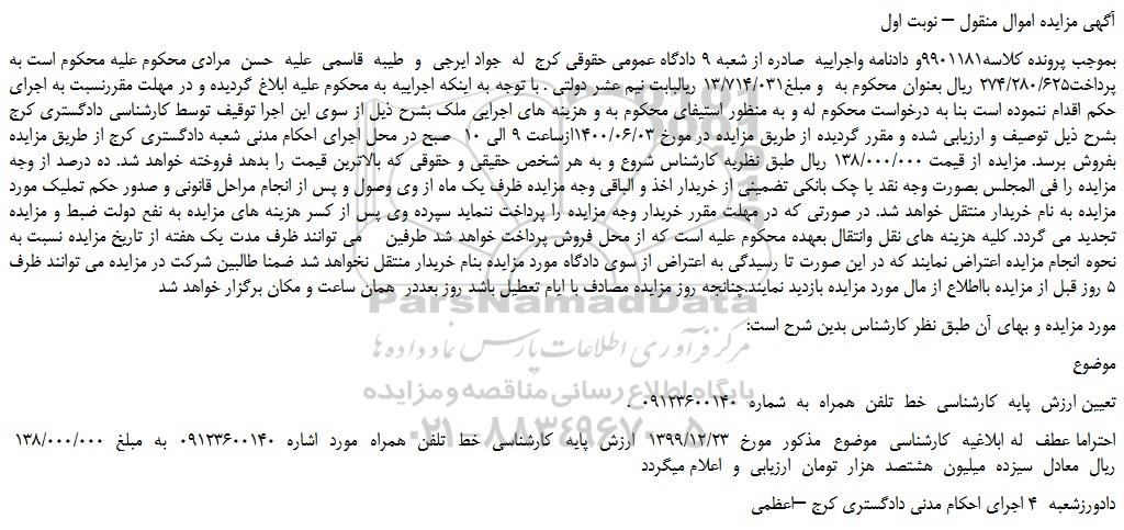 بموجب پرونده کلاسه9901181و دادنامه واجراییه صادره از شعبه 9 دادگاه عمومی حقوقی کرج له جواد ایرجی و طیبه قاسمی علیه حسن مرادی محکوم علیه محکوم است به پرداخت274/280/625 ریال بعنوان محکوم به و مبلغ13/714/031 ریالبابت نیم عشر دولتی . با توجه به اینکه اجراییه به محکوم علیه ابلاغ گردیده و در مهلت مقررنسبت به اجرای حکم اقدام ننموده است بنا به درخواست محکوم له و به منظور استیفای محکوم به و هزینه های اجرایی ملک بشرح ذیل از سوی این اجرا توقیف توسط کارشناسی دادگستری کرج بشرح ذیل توصیف و ارزیابی شده و مقرر گردیده از طریق مزایده در مورخ 1400/06/03ازساعت 9 الی 10 صبح در محل اجرای احکام مدنی شعبه دادگستری کرج از طریق مزایده بفروش برسد. مزایده از قیمت 138/000/000 ریال طبق نظریه کارشناس شروع و به هر شخص حقیقی و حقوقی که بالاترین قیمت را بدهد فروخته خواهد شد. ده درصد از وجه مزایده را فی المجلس بصورت وجه نقد یا چک بانکی تضمینی از خریدار اخذ و الباقی وجه مزایده ظرف یک ماه از وی وصول و پس از انجام مراحل قانونی و صدور حکم تملیک مورد مزایده به نام خریدار منتقل خواهد شد. در صورتی که در مهلت مقرر خریدار وجه مزایده را پرداخت ننماید سپرده وی پس از کسر هزینه های مزایده به نفع دولت ضبط و مزایده تجدید می گردد. کلیه هزینه های نقل وانتقال بعهده محکوم علیه است که از محل فروش پرداخت خواهد شد طرفین می توانند ظرف مدت یک هفته از تاریخ مزایده نسبت به نحوه انجام مزایده اعتراض نمایند که در این صورت تا رسیدگی به اعتراض از سوی دادگاه مورد مزایده بنام خریدار منتقل نخواهد شد ضمنا طالبین شرکت در مزایده می توانند ظرف 5 روز قبل از مزایده بااطلاع از مال مورد مزایده بازدید نمایند.چنانجه روز مزایده مصادف با ایام تعطیل باشد روز بعددر همان ساعت و مکان برگزار خواهد شد