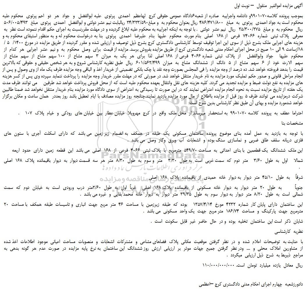 بموجب پرونده کلاسه9901070و دادنامه واجراییه صادره از شعبه6دادگاه عمومی حقوقی کرج لهاعظم احمدی پرتوی علیه ابوالفضل و جواد هر دو احم پرتوی محکوم علیه محکوم است به جواد احمدی پرتوی به مبلغ 486/471/800 ریال بعنوان محکوم به و مبلغ24/323/590 ریالبابت نیم عشر دولتی و ابوالفضل احمدی پرتوی مبلغ 506/005/493 ریال محکوم به و مبلغ 25/300/275 ریال نیم عشر دولتی . با توجه به اینکه اجراییه به محکوم علیه ابلاغ گردیده و در مهلت مقررنسبت به اجرای حکم اقدام ننموده است نظر به معرفی پلاک ثبتی شماره 74066 فرعی از 168 اصلی بنام مورث محکوم علیها بنام علیرضا احمدی پرتوی بنا به درخواست محکوم له و به منظور استیفای محکوم به و هزینه های اجرایی ملک بشرح ذیل از سوی این اجرا توقیف توسط کارشناسی دادگستری کرج بشرح ذیل توصیف و ارزیابی شده و مقرر گردیده از طریق مزایده در مورخ 1400/ 5 / 18ازساعت 9 الی 10 صبح در محل اجرای احکام مدنی شعبه دادگستری کرج از طریق مزایده بفروش برسد. مزایده از قیمت برای وصل محکوم به و نیم عشر اجرایی هر کدام از محکوم علیها جواد وابوالفضل از پلاک ثبتی شماره 4066 فرعی از 168 اصلی لذا برای هر یک به میزان 3 سهم مشاع از 100 سهم مشاع از سهم مشاع از سهم الارث خود از 6 سهم مشاع از 5 دانگ از ششدانگ مشاع به میزان 601/562/499 ریال طبق نظریه کارشناس شروع و به هر شخص حقیقی و حقوقی که بالاترین قیمت را بدهد فروخته خواهد شد. ده درصد از وجه مزایده را فی المجلس بصورت وجه نقد یا چک بانکی تضمینی از خریدار اخذ و الباقی وجه مزایده ظرف یک ماه از وی وصول و پس از انجام مراحل قانونی و صدور حکم تملیک مورد مزایده به نام خریدار منتقل خواهد شد. در صورتی که در مهلت مقرر خریدار وجه مزایده را پرداخت ننماید سپرده وی پس از کسر هزینه های مزایده به نفع دولت ضبط و مزایده تجدید می گردد. کلیه هزینه های نقل وانتقال بعهده محکوم علیه است که از محل فروش پرداخت خواهد شد طرفین می توانند ظرف مدت یک هفته از تاریخ مزایده نسبت به نحوه انجام مزایده اعتراض نمایند که در این صورت تا رسیدگی به اعتراض از سوی دادگاه مورد مزایده بنام خریدار منتقل نخواهد شد ضمنا طالبین شرکت درمزایده می توانند ظرف 5 روز قبل از مزایده بااطلاع از مال مورد مزایده بازدید نمایند.چنانجه روز مزایده مصادف با ایام تعطیل باشد روز بعددر همان ساعت و مکان برگزار خواهد شدمورد مزایده و بهای آن طبق نظر کارشناس بدین شرح است: