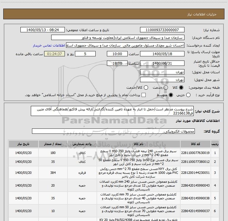| 3 | 2281200144230051 | کابل برق NYY مسی سطح مقطع 70 mm^2 جنس روکش PVC طول 1000 m تعداد رشته 1 نوع بسته بندی قرقره مرجع سازنده شرکت کابل باختر | قرقره | 384 | 1400/05/20 |