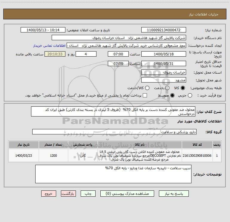 شرح کلی نیاز: محلول ضد عفونی کننده دست بر پایه الکل 70% (ظروف 5 لیتری در بسته بندی کارتن) طبق ایران کد درخواستی