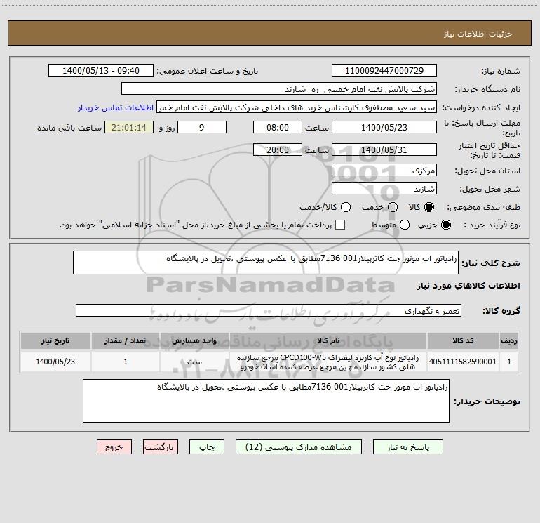 شرح کلی نیاز: رادیاتور اب موتور جت کاترپیلار001 7136مطابق با عکس پیوستی ،تحویل در پالایشگاه