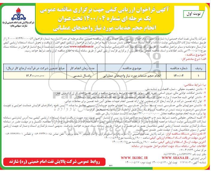 یک مرحله ای شماره 04 / 1400 تحت عنوان انجام حجم خدمات مورد نیاز واحدهای عملیاتی