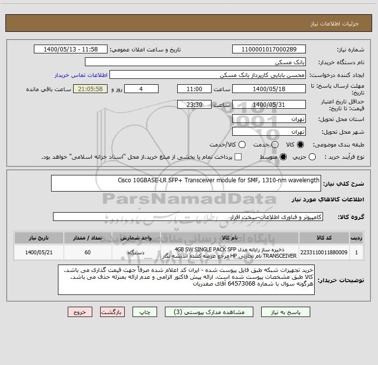 شرح کلی نیاز: Cisco 10GBASE-LR SFP+ Transceiver module for SMF, 1310-nm wavelength