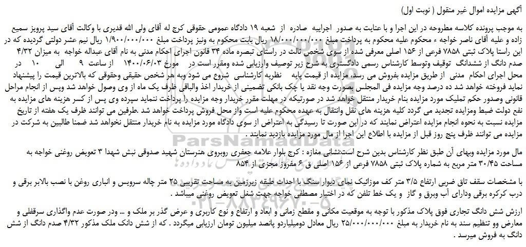 به موجب پرونده کلاسه مطروحه در این اجرا و با عنایت به صدور اجراییه صادره از شعبه 19 دادگاه عمومی حقوقی کرج له آقای ولی الله قدیری با وکالت آقای سید پرویز سمیع زاده و علیه آقای ناصر خواجه ء محکوم علیه محکوم به پرداخت مبلغ 18/000/000/000 ریال بابت محکوم به ونیز پرداخت مبلغ 1/900/000/000 ریال نیم عشر دولتی گردیده که در این راستا پلاک ثبتی 7858 فرعی از 156 اصلی معرفی شده از سوی شخص ثالث در راستای تبصره ماده 34 قانون اجرای احکام مدنی به نام آقای عبداله خواجه به میزان 4/32 صدم دانگ از ششدانگ توقیف وتوسط کارشناس رسمی دادگستری به شرح زیر توصیف وارزیابی شده ومقرر است در مورخ 1400/06/03 از ساعت 9 الی 10 در محل اجرای احکام مدنی از طریق مزایده بفروش می رسد، مزایده از قیمت پایه نظریه کارشناسی شروع می شود وبه هر شخص حقیقی وحقوقی که بالاترین قیمت را پیشنهاد نماید فروخته خواهد شد ده درصد وجه مزایده فی المجلس بصورت وجه نقد یا چک بانکی تضمینی از خریدار اخذ والباقی ظرف یک ماه از وی وصول خواهد شد وپس از انجام مراحل قانونی وصدور حکم تملیک مورد مزایده بنام خریدار منتقل خواهد شد در صورتیکه در مهلت مقرر خریدار وجه مزایده را پرداخت ننماید سپرده وی پس از کسر هزینه های مزایده به نفع دولت ضبط ومزایده تجدید می گردد کلیه هزینه های نقل وانتقال به عهده محکوم علیه است واز محل فروش پرداخت خواهد شد .طرفین می توانند ظرف یک هفته از تاریخ مزایده نسبت به نحوه انجام مزایده اعتراض نمایند که در این صورت تا رسیدگی به اعتراض از سوی دادگاه مورد مزایده به نام خریدار منتقل نخواهد شد ضمنا طالبین به شرکت در مزایده می توانند ظرف پنج روز قبل از مزایده با اطلاع این اجرا از مال مورد مزایده بازدید نمایند .