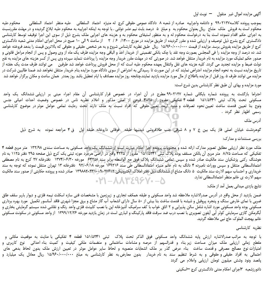 بموجب پرونده کلاسه9902127  و دادنامه واجراییه  صادره از شعبه 8  دادگاه عمومی حقوقی کرج  له منیژه  اعتماد  السلطانی    علیه منظر  اعتماد  السلطانی      محکوم علیه محکوم است به فروش  ملک  مشاع  ریال بعنوان محکوم به  و مبلغ  5  درصد بابت نیم عشر دولتی . با توجه به اینکه اجراییه به محکوم علیه ابلاغ گردیده و در مهلت مقررنسبت به اجرای حکم اقدام ننموده است بنا به درخواست محکوم له و به منظور استیفای محکوم به و هزینه های اجرایی ملک بشرح ذیل از سوی این اجرا توقیف توسط کارشناسی دادگستری کرج بشرح ذیل توصیف و ارزیابی شده و مقرر گردیده از طریق مزایده در مورخ 1400/  6 /  2    از ساعت 9 الی 10 صبح در محل اجرای احکام مدنی شعبه دادگستری کرج از طریق مزایده بفروش برسد. مزایده از قیمت 15/960/000/000  ریال  طبق نظریه کارشناس شروع و به هر شخص حقیقی و حقوقی که بالاترین قیمت را بدهد فروخته خواهد شد. ده درصد از وجه مزایده را فی المجلس بصورت وجه نقد یا چک بانکی تضمینی از خریدار اخذ و الباقی وجه مزایده ظرف یک ماه از وی وصول و پس از انجام مراحل قانونی و صدور حکم تملیک مورد مزایده به نام خریدار منتقل خواهد شد. در صورتی که در مهلت مقرر خریدار وجه مزایده را پرداخت ننماید سپرده وی پس از کسر هزینه های مزایده به نفع دولت ضبط و مزایده تجدید می گردد. کلیه هزینه های نقل وانتقال بعهده محکوم علیه است که از محل فروش پرداخت خواهد شد طرفین    می توانند ظرف مدت یک هفته از تاریخ مزایده نسبت به نحوه انجام مزایده اعتراض نمایند که در این صورت تا رسیدگی به اعتراض از سوی دادگاه مورد مزایده بنام خریدار منتقل نخواهد شد ضمنا طالبین شرکت در مزایده می توانند ظرف 5 روز قبل از مزایده بااطلاع از مال مورد مزایده بازدید نمایند.چنانجه روز مزایده مصادف با ایام تعطیل باشد روز بعددر  همان ساعت و مکان برگزار خواهد شد
