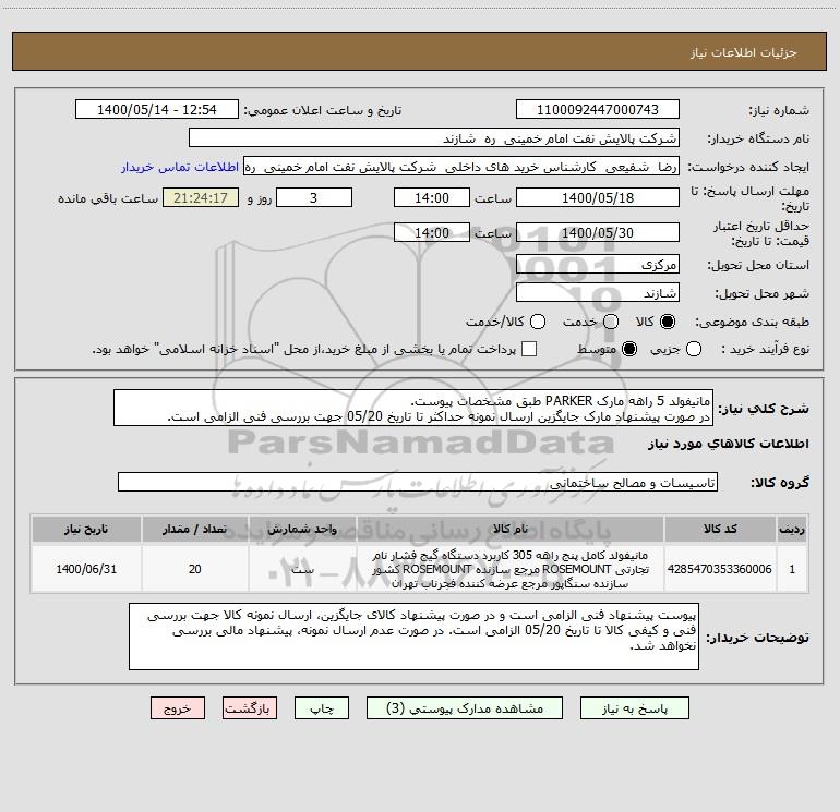 شرح کلی نیاز: مانیفولد 5 راهه مارک PARKER طبق مشخصات پیوست.