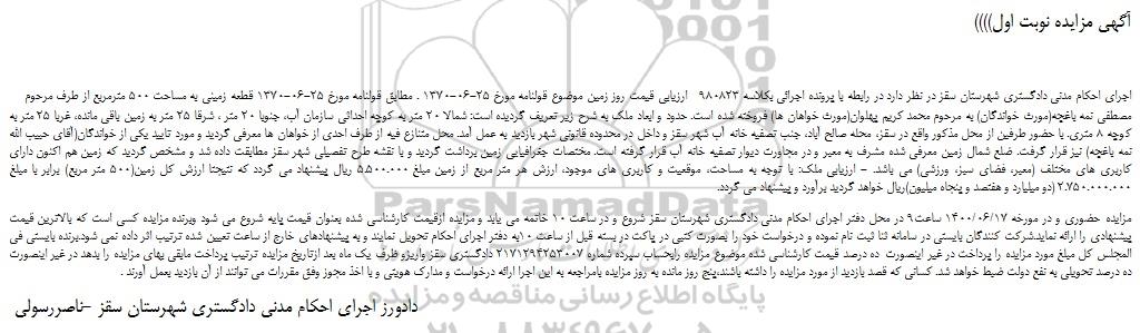 اجرای احکام مدنی دادگستری شهرستان سقز در نظر دارد در رابطه با پرونده اجرائی بکلاسه 980823 ارزیابی قیمت روز زمین موضوع قولنامه مورخ 25-06-1370 . مطابق قولنامه مورخ 25-06-1370 قطعه زمینی به مساحت 500 مترمربع از طرف مرحوم مصطفی نمه باغچه(مورث خواندگان) به مرحوم محمد کریم پهلوان(مورث خواهان ها) فروخته شده است. حدود و ابعاد ملک به شرح زیر تعریف گردیده است: شمالا 20 متر به کوچه احداثی سازمان آب، جنوبا 20 متر ، شرقا 25 متر به زمین باقی مانده، غربا 25 متر به کوچه 8 متری. با حضور طرفین از محل مذکور واقع در سقز، محله صالح آباد، جنب تصفیه خانه آب شهر سقز و داخل در محدوده قانونی شهر بازدید به عمل آمد. محل متنازع فیه از طرف احدی از خواهان ها معرفی گردید و مورد تایید یکی از خواندگان(آقای حبیب الله نمه باغچه) نیز قرار گرفت. ضلع شمال زمین معرفی شده مشرف به معبر و در مجاورت دیوار تصفیه خانه آب قرار گرفته است. مختصات جغرافیایی زمین برداشت گردید و با نقشه طرح تفصیلی شهر سقز مطابقت داده شد و مشخص گردید که زمین هم اکنون دارای کاربری های مختلف (معبر، فضای سبز، ورزشی) می باشد. - ارزیابی ملک: با توجه به مساحت، موقعیت و کاربری های موجود، ارزش هر متر مربع از زمین مبلغ 5.500.000 ریال پیشنهاد می گردد که نتیجتا ارزش کل زمین(500 متر مربع) برابر با مبلغ 2.750.000.000 (دو میلیارد و هفتصد و پنجاه میلیون)ریال خواهد گردید برآورد و پیشنهاد می گردد.