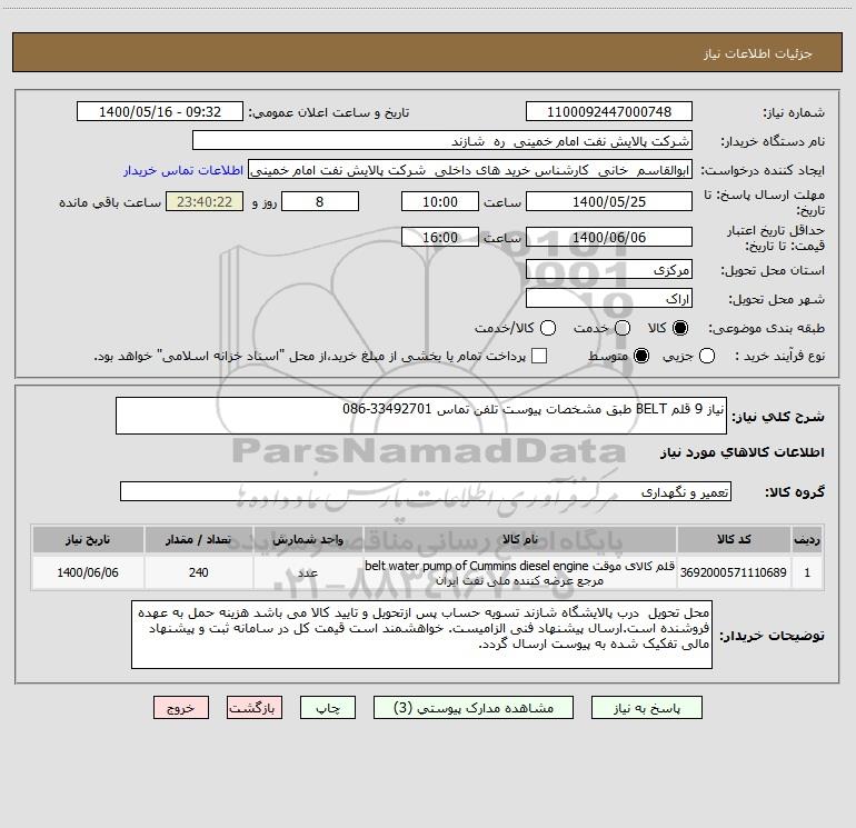 شرح کلی نیاز: نیاز 9 قلم BELT طبق مشخصات پیوست تلفن تماس 33492701-086