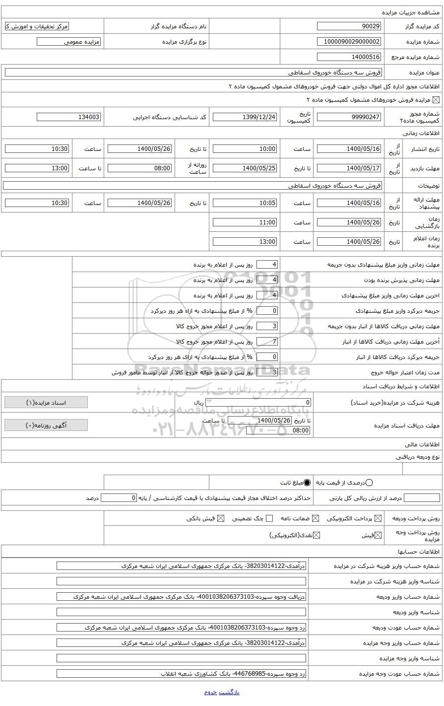 | عنوان مزایده | فروش سه دستگاه خودروی اسقاطی | |||