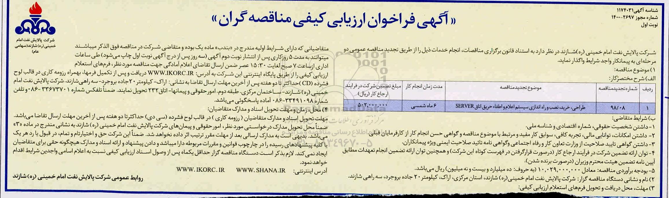 | 98/08 | طراحی، خرید، نصب و راه اندازی سیستم اعلام و اطفا حریق server | 6 ماه شمسی | 502.000.000 |